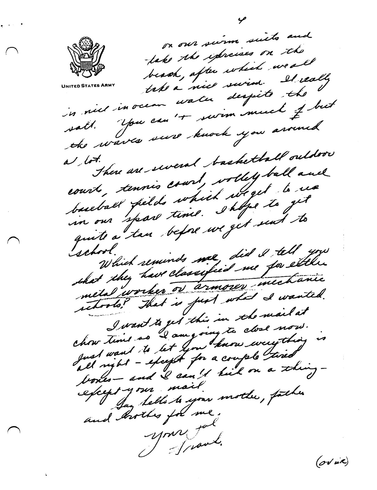 Which reminds me, did I tell you that they have classified me for either metal worker or armorer mechanic schools? That is just what I wanted. I want to get this in the mail at chow time so I am going to close now. Just want to let you know everything is all right—except for a couple of tired bones—and I can’t kick on a thin—except your mail.